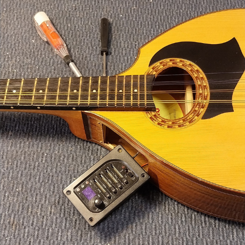 Se saca el mango del encastre del instrumento para corregir el ángulo de este, a fin de lograr una altura óptima del puente, y de esta manera regular la altura de las cuerdas con respecto a la tastiera.