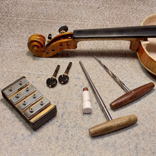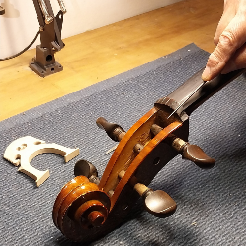 Ajustamos las clavijas con herramientas adecuadas para darles la conicidad que necesitan para asegurar una afinación estable y precisa.