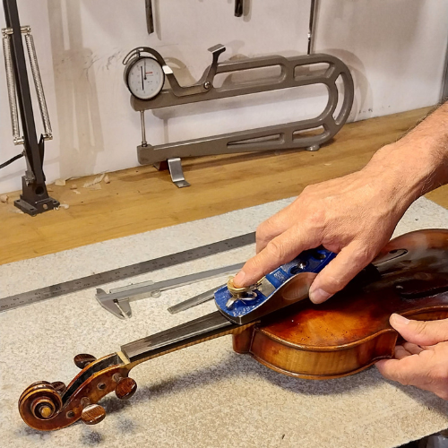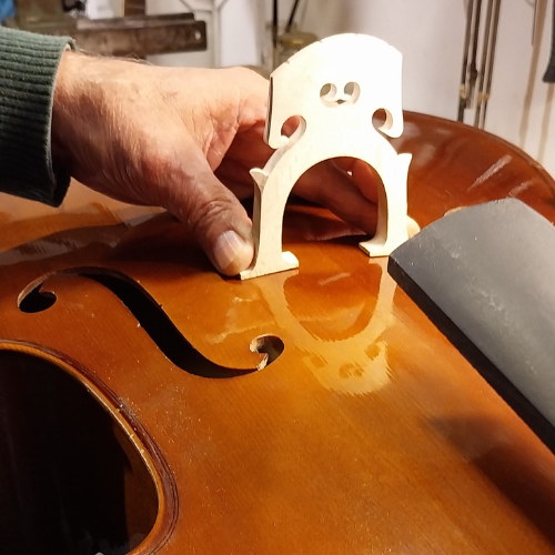 El ajuste incluye calzar en forma perfecta el pie del puente con la curvatura de la tapa del violín. Además, el ajuste de puente, considera darle las medidas y grosores adecuados para que sea liviano pero resistente.